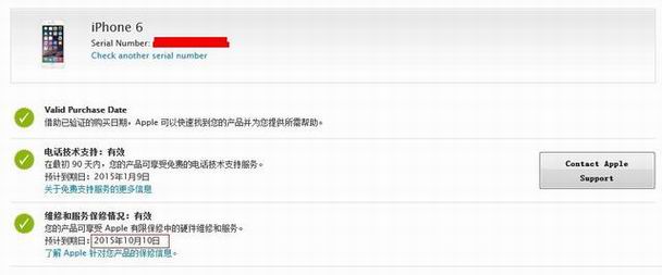 由于iPhone6是从激活日起保修一年的,从图中,我们可以看到iPhone6 Plus保修到期时间是2015年10月10日,如果这这个日期与购入后的激活时间相差一年,就可以判断属于正品行货新机。