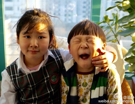 今日中午,演员梁静通过微博晒出一张女儿丫丫和儿子犇犇的搞怪照片,照片中,丫丫扎着马尾辫,一只手搭在犇犇肩上,犇犇则闭眼张嘴,做出夸张表情。
