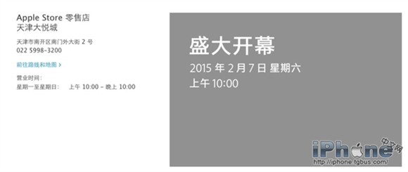 苹果官网已经更新,天津大悦城店将会在2月7日星期六上午10点盛大开幕,而这也是天津的首家Apple Store。其具体地点是天津市南开区南门外大街2号,营业时间为星期一至星期日上午10:00 - 晚上10:00。
